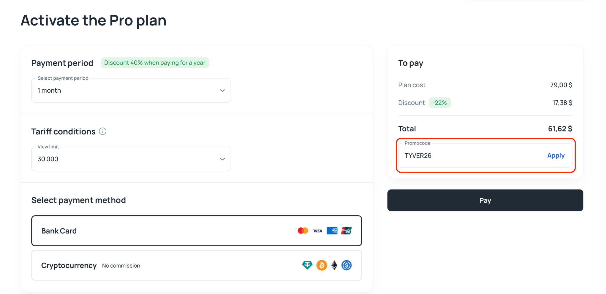 - Step 2: Choose a subscription plan. Select the plan that fits your needs (Pro or Team) and choose the subscription period. If you didn’t apply the TYVER26 promo code during registration, you can enter it at this stage and still receive the discount. Your savings will be displayed immediately.