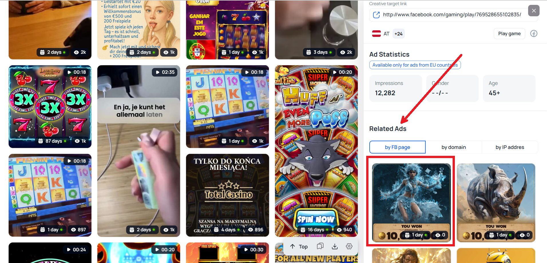 First, you need to find all creatives launched through a single Fan Page. To do this, open a creative from the results and scroll down to “Related ads”.