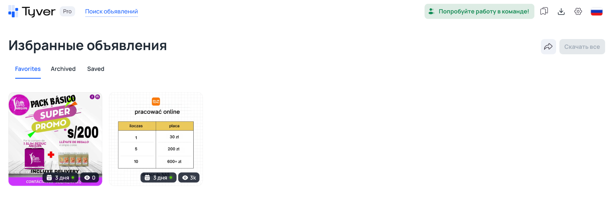 - Сохранение и обмен креативами. Возможность сохранять нужные объявления в подборки и делиться ими с командой.
