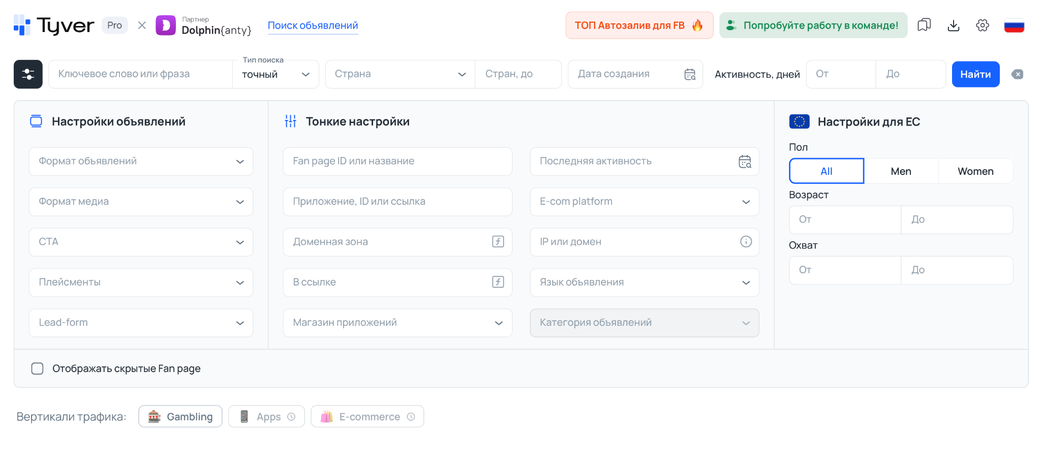 Tyver ежедневно выгружает миллионы новых объявлений из десятков стран. Благодаря этому в выдаче всегда присутствуют свежие креативы и актуальные подходы, которые прямо сейчас используются в разных вертикалях и гео.